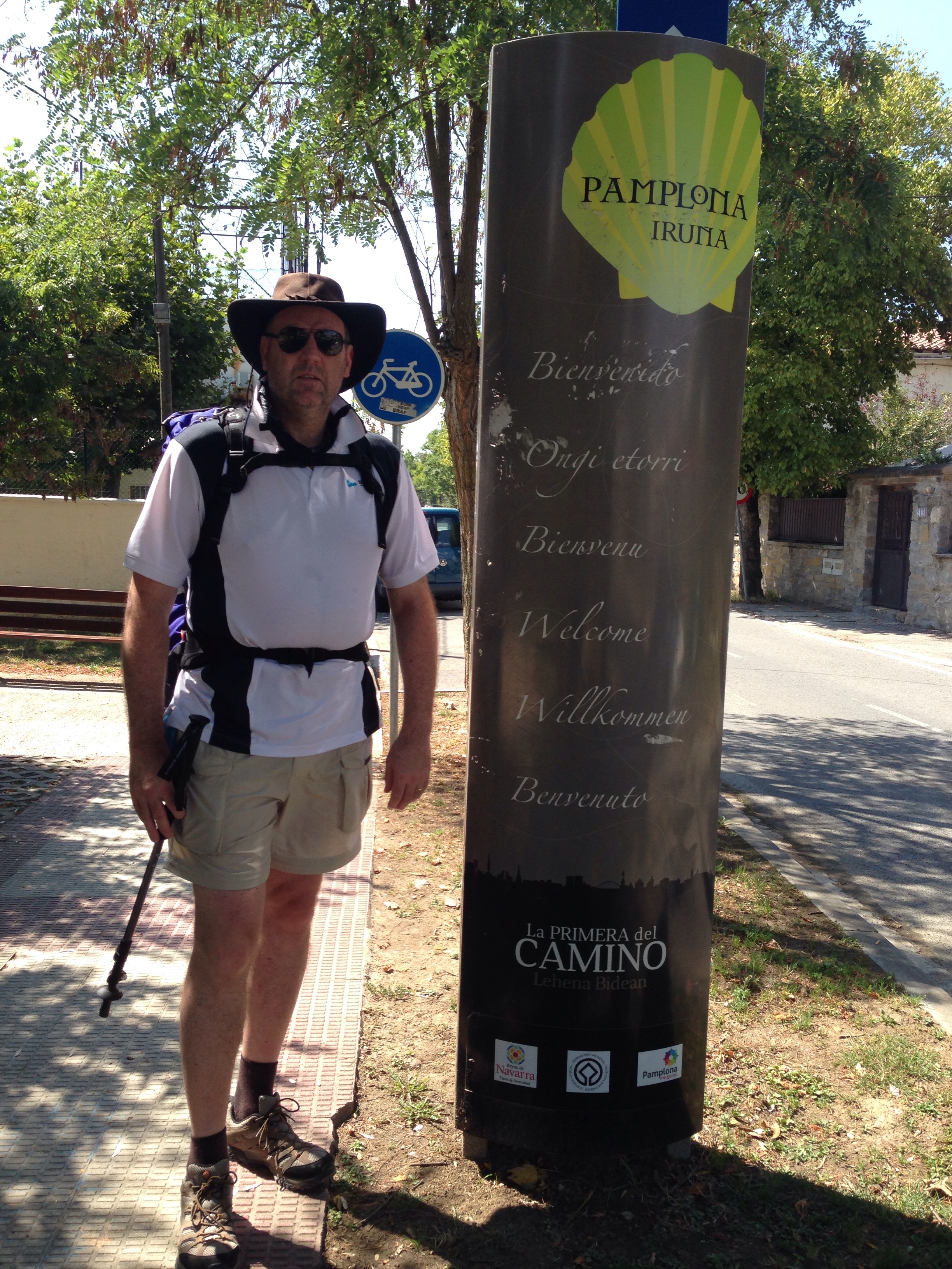 Day 5 was a long day. We started a little later than planned and the temperature rose to 32c during the day. Once again the Camino put a mountain in the way. A gradual 12 km ascent out of Pamplona to a height of about 900 metres, then down over a distance of 3km. I swear descending is harder than ascending. At the peak of the mountian are very famous statues of pilgrims, cut out of metal. Also this area is full of windmills generating power. We coved 24.6km over a period of 8.5 hours, we stopped for an hour for lunch in the shade of an old church, next to their fountain. A little shop was baking bread and made Bocadillio’s to order. We had a very nice Jamin and tomato roll and a can of drink for €2.7 each.