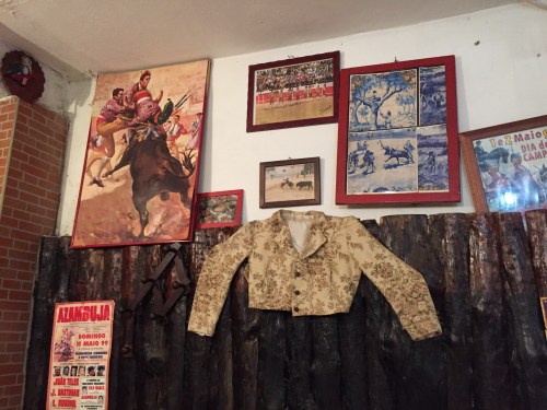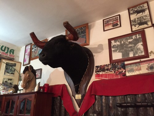 At the foot of the hill into town we found a little cafe/restaurant tucked away, no signs or anything that indicated what it was but the woman that ran the place come out and beckoned us in. It was a surprising place, not fancy but it contained a lot of bullfighting memorabilia including a stuffed bulls head on the wall. The woman indicated that she was the mother of a bullfighter in one of the photos. Not a flattering photo as he was being tossed into the air by the bull. The bulls head on the wall looked a lot like the bull in the photo. We briefly met her son as he was going through the cafe.