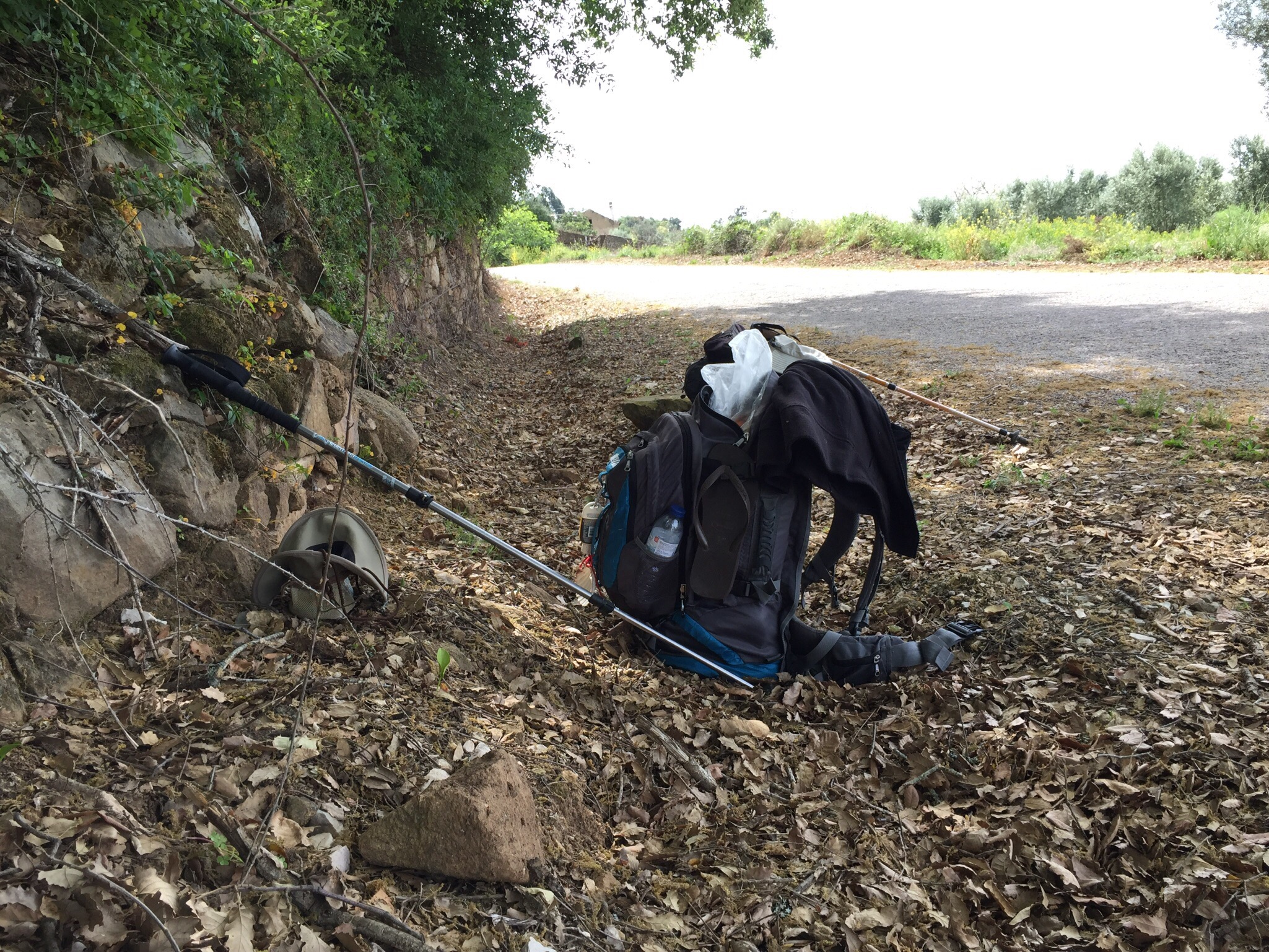 After the first 11km there was no support on the track, we knew this in advance and had stocked up on fresh fruit and water the night before. About 4kg worth. We consumed all, bar one apple during the day. We stopped several times along side the road in the shade of Eucalyptus trees, as well in an olive grove, and once in the forest. There are no seats etc, so we just laid out a ground sheet and sat in the shade while we caught our breath. We both had to use natures toilet!