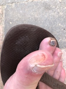 I have my first blister, on my big toe. Might need to do something about it soon. The black toe is from a domestic incident not the Camino.