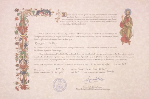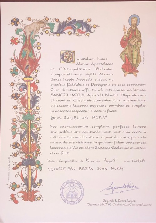 The Compostela in my name is also made “Vicarie Pro Brian John Mckay” which means on behalf of or in place of in Latin. I have dedicated this Camino to my father.