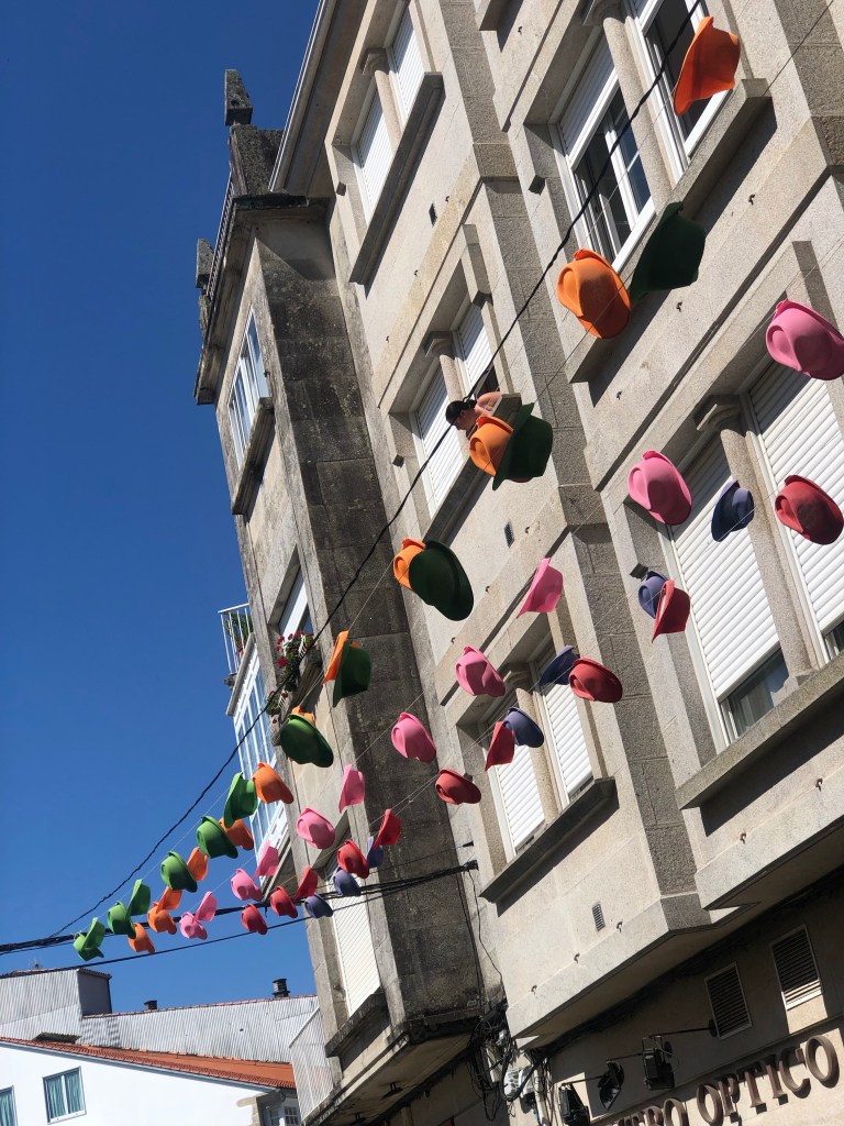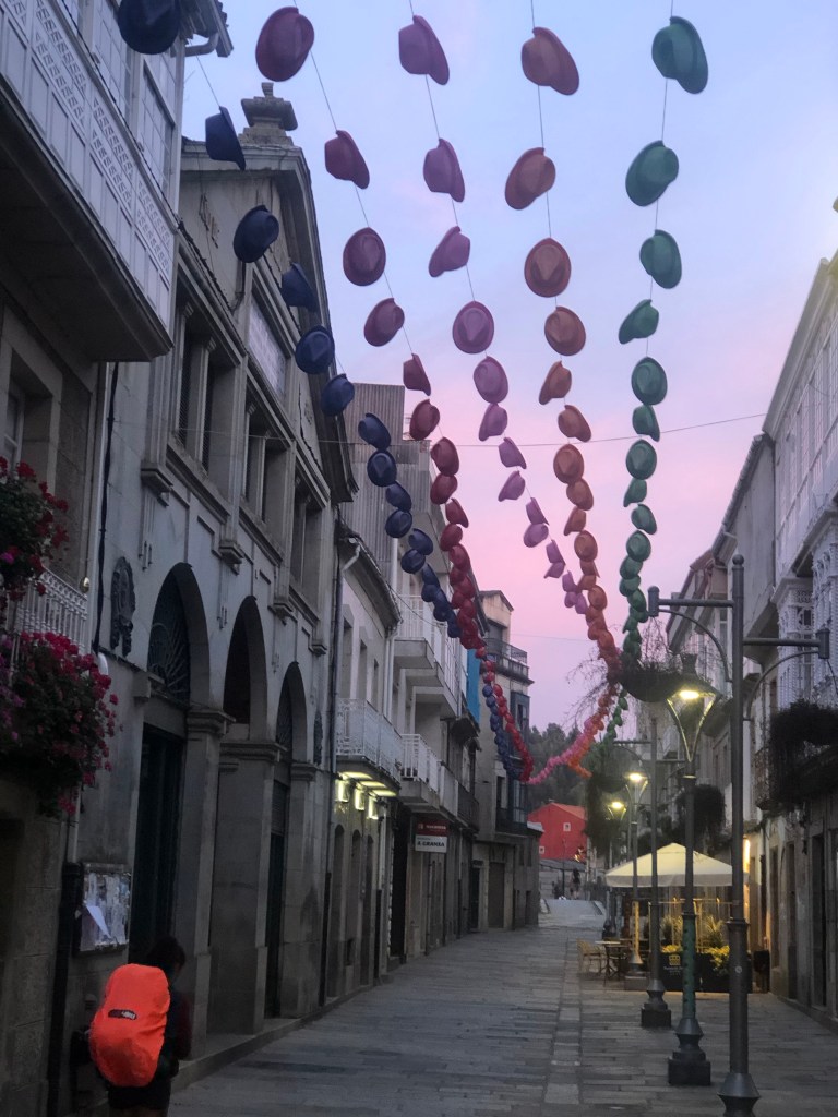 Leaving town at sunrise has become a habit, as we can cover a greater distance before the days starts to heat up. One of the earlier town we visited in Portugal had umbrellas lining the sky in the streets, this on had hats.
