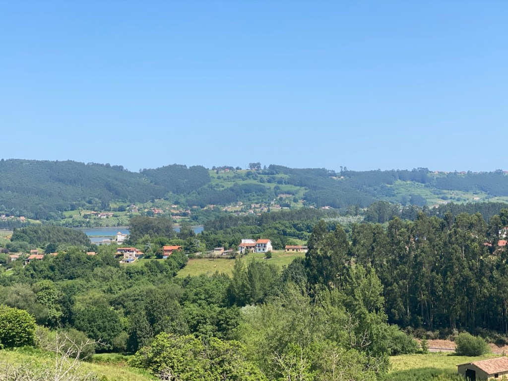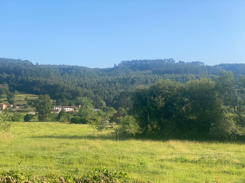 The road went through rolling hills up a valley with a range of large hills on the left and an absolutely huge mountain range on the left. These mountains have been on my left since Llanes or earlier.